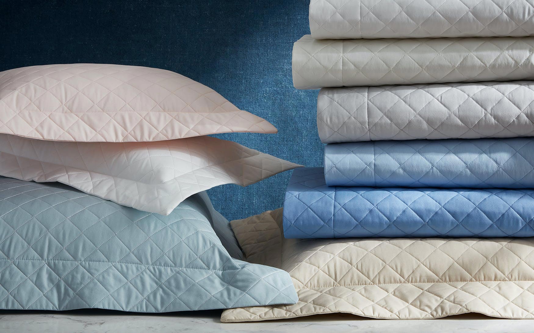 In an array of soft colors, Gemma is our quintessential quilt for those who prefer a crisp, cotton percale over sateen’s sheen. Designed to coordinate with our entire percale collection, Gemma sports a simple diamond pattern finished with self-piping and has a lofty look and easy drape.