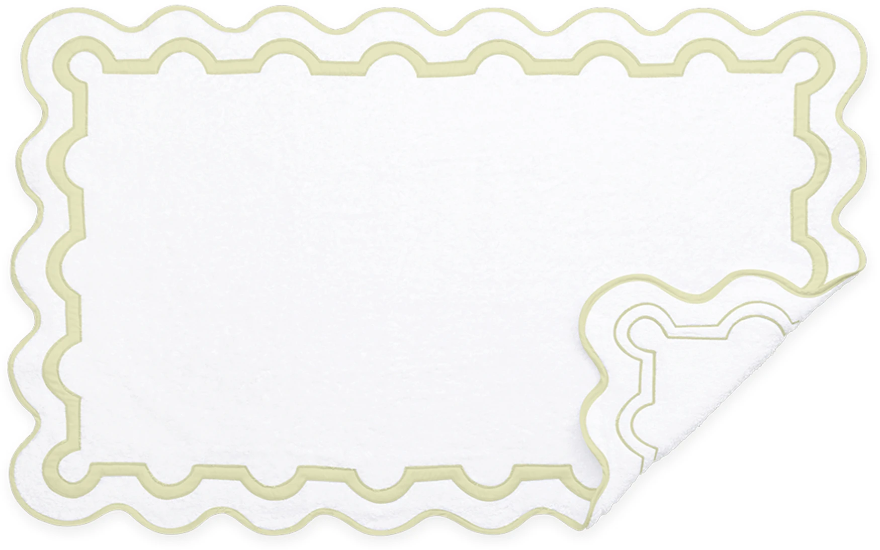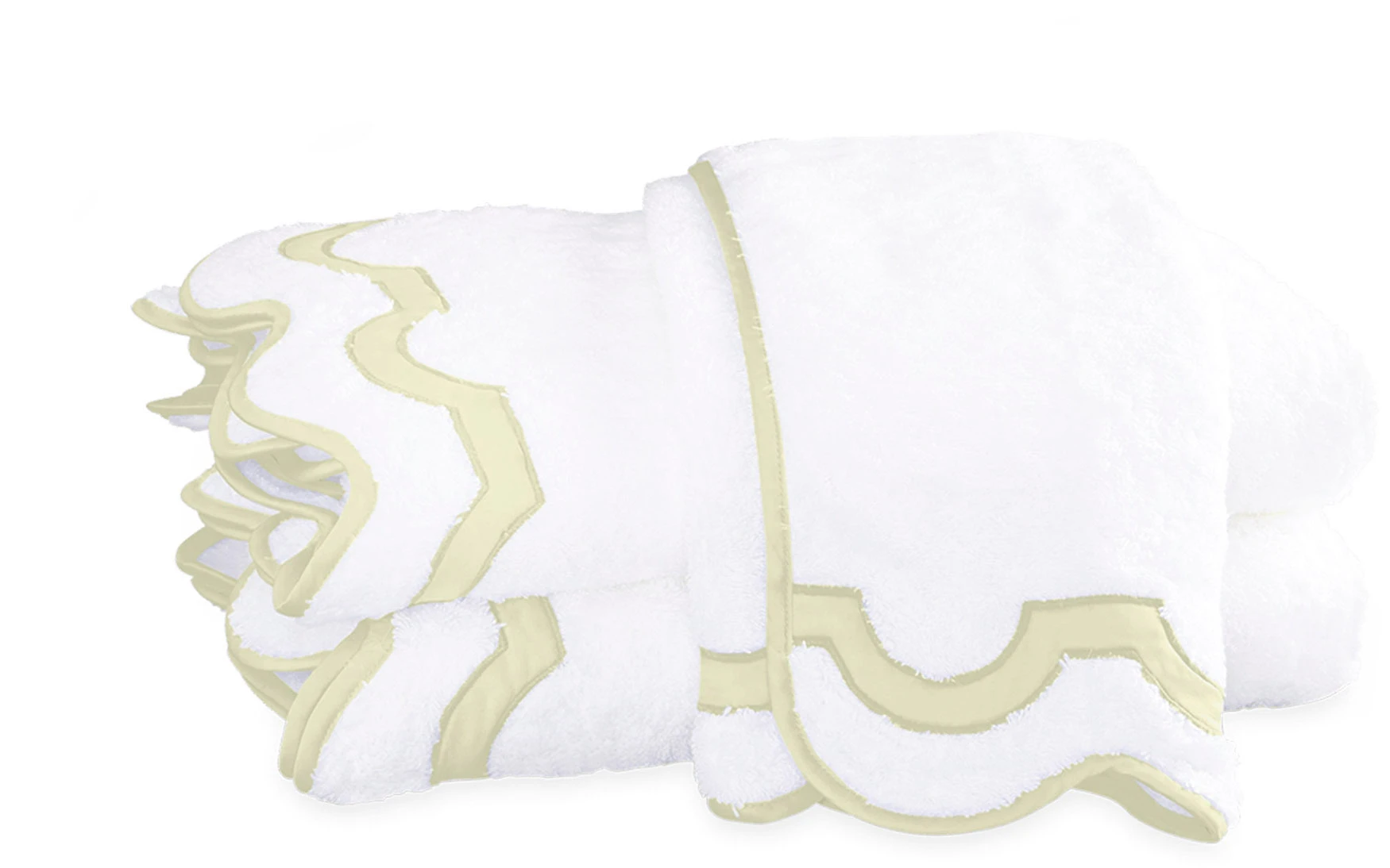 A chic shop awning in Palm Beach inspired the motif that unites our Mirasol collections. For the bath, the border is a stunning Nocturne sateen appliqué on our Cairo cotton terry towels with a scallop piping to finish.
